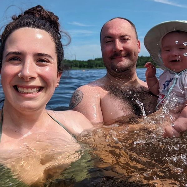 "This is our 7-month old Great Grandson Rylee, with his mom and dad, getting into the swim of things.